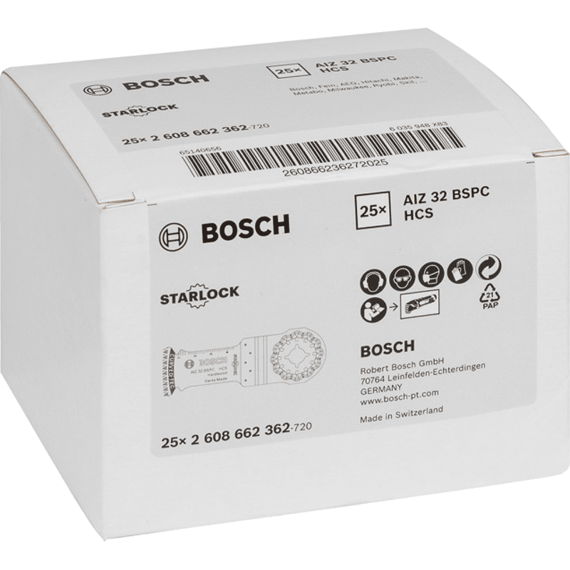 Das Tauchsägeblatt Starlock AIZ 32 BSPC ermöglicht saubere Schnitte in Hartholz. Seine dreidimensionale japanische Zahnanordnung besteht aus scharfgeschliffenen Zähnen, die ideal für ausrissfreies Sägen geeignet sind. Diese Zahnanordnung minimiert die Wärmeentwicklung und ermöglicht sehr saubere Schnitte ohne Auszackung oder Hitzespuren. Das robuste Starlock-Aufnahmesystem reduziert Lateralschwingung und ermöglicht mittels direkter Kraftübertragung präzise Schnitte. Dieses Produkt wird verwendet für das Tauchsägen in Hartholz, das Sägen von Aussparungen in Möbelbauteile sowie das Sägen von Holzpaneelen. Die abgerundete Blattspitze (Curved-Tec) ermöglicht präzise und glatte Tauchschnitte. Das Starlock-Aufnahmesystem ermöglicht einen schnellen Blattwechsel ohne Blattberührung in drei Sekunden. Das Aufnahmesystem ermöglicht durch seine dreidimensionale enge Passung maximale Kraftübertragung zwischen Maschine und Zubehör.